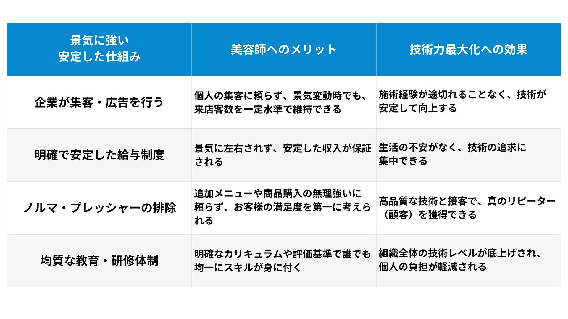 そうではなく、企業(経営)が責任を持って「集客の仕組み」を構築しているサロンこそ、景気に左右されることなく、美容師が技術とキャリアを安定して伸ばせる理想的な環境と言えるでしょう。