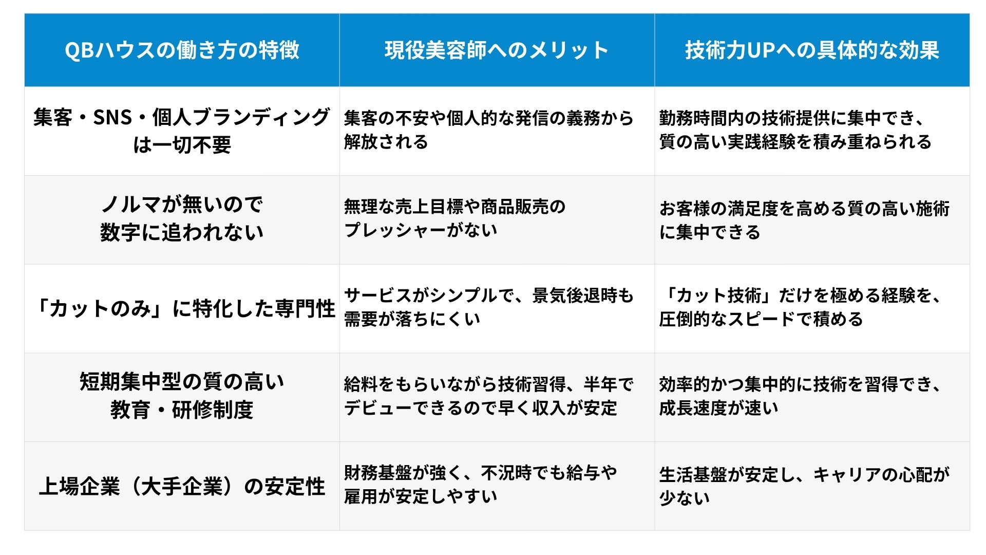 安定して働きながら技術を磨くなら、カット専門店で働くという選択肢もあります。カット専門店はフルメニュー型の美容室に比べ、景気の影響を受けにくいといわれます。なぜなら、髪は必ず伸びる=カット需要は安定しており、カラーやパーマのように「控える」「やめる」という行動が起きにくいからです。またメニューが絞られている分、材料費の変動も受けにくく、短時間施術で回転力もあるため、不況下でも一定の売上を維持しやすい構造を持っています。中でも代表的な存在である私たちQBハウスは、前述の「美容室が安定する条件」を高いレベルで満たしています。その理由を以下に整理しました。