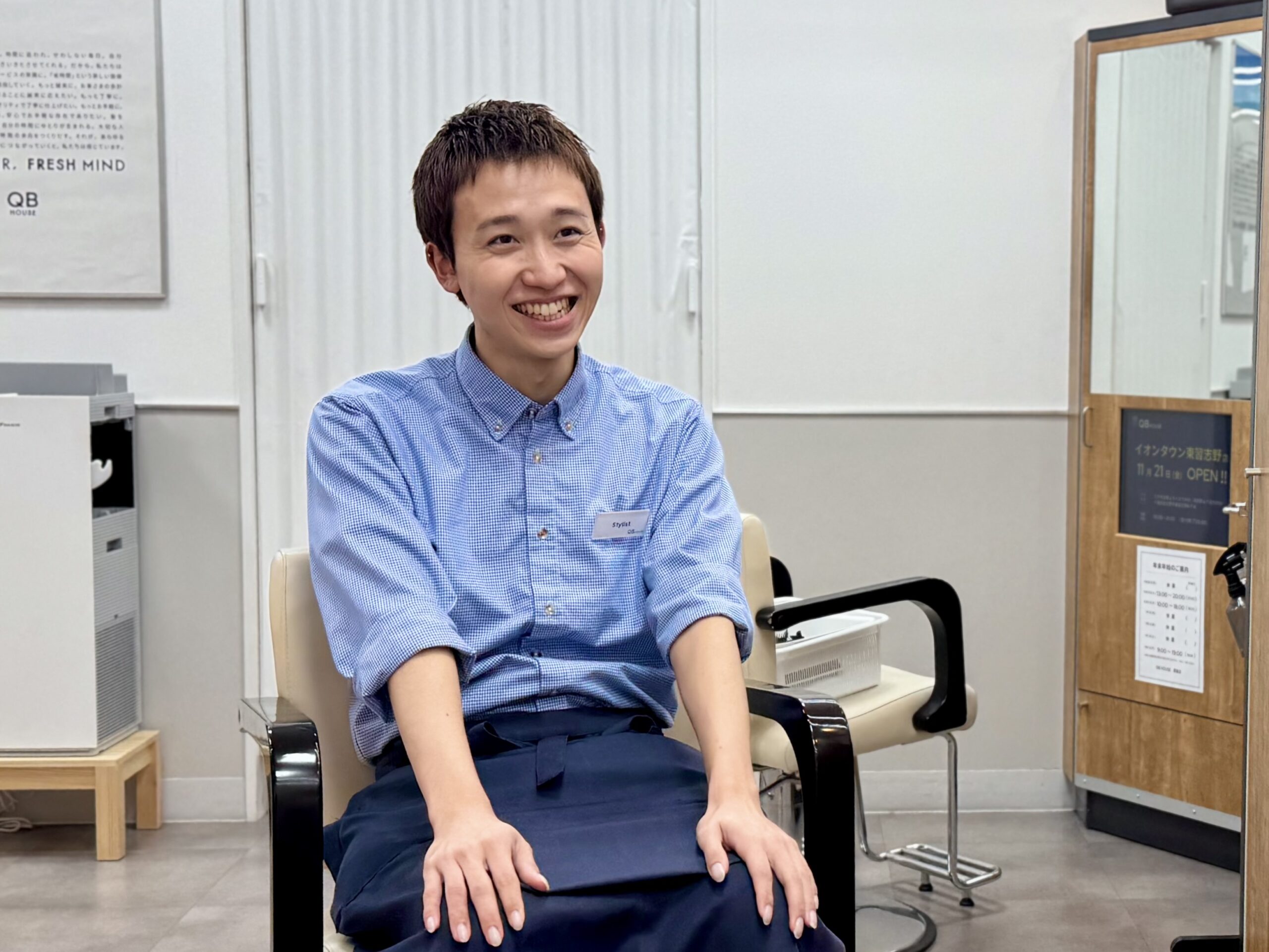 一番大きく変わったと感じているのは、人間関係に悩まなくなったことです。前職では、先輩同士の間に立つ“クッション役”のような立場になることも多く、常に周りの空気を気にしていました。QBHOUSEでは、同期も新卒だけでなく、他業種経験者や子育てを終えた方など年齢や経歴がさまざまで、お互いの経験や考え方を尊重し合える雰囲気があります。店舗勤務中、忙しい時に対応が遅れてしまったときも先輩が自然にフォローしてくれたり、「落ち着いて大丈夫だよ」と声をかけてくれたりするので、一人で抱え込むことがありません。